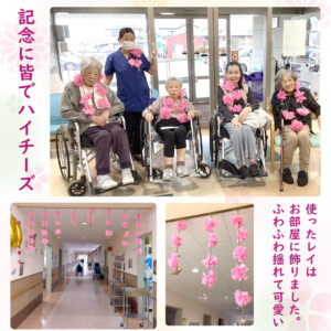 皆様が作った桜の花をハワイのレイのように首に飾り気分アゲアゲ♪