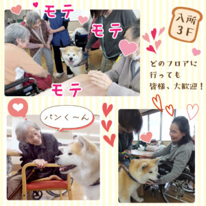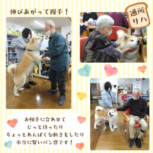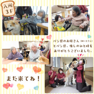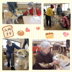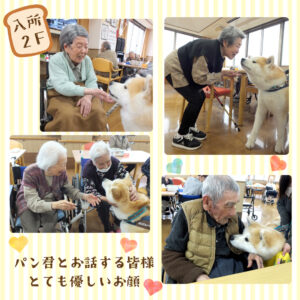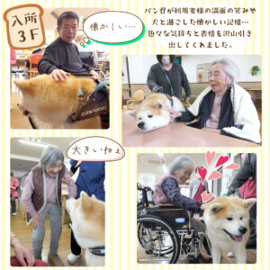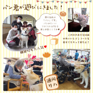 犬を飼われていたことを思い出しその頃一緒にいたワンちゃんの大きさや犬種お名前等を懐かしくお話してくださった方もいらしたりと、パン君が利用者様の普段見られない微笑みや優しいお顔を引き出してくれました。